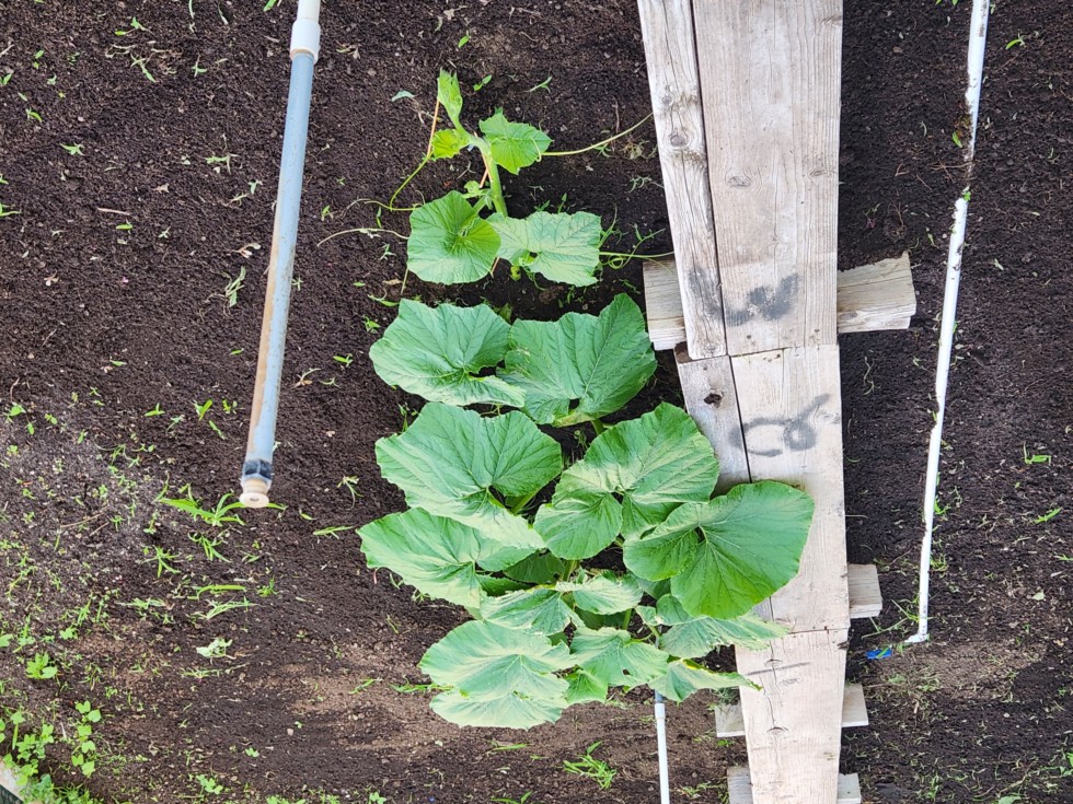 1461 Rodebaugh has a baby pumpkin in the grow tip. Plant is almost 8 feet long with 10 secondaries started.