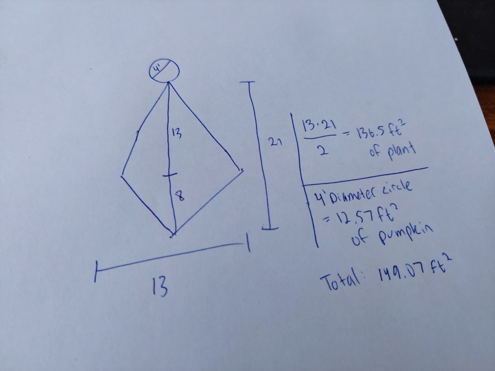 150 plant diagram, 21x13 diamond shape with a 4' circle on the end for the pumpkin, 149 square feet and change.