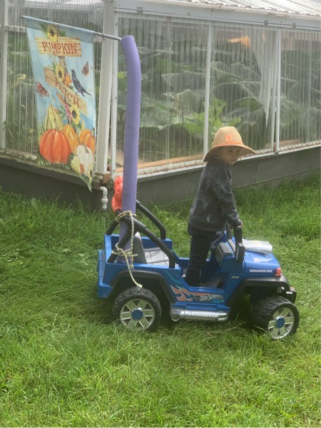 Wyatt my 4 year old grand son has his rally wagon ready , we lift pumpkins Monday