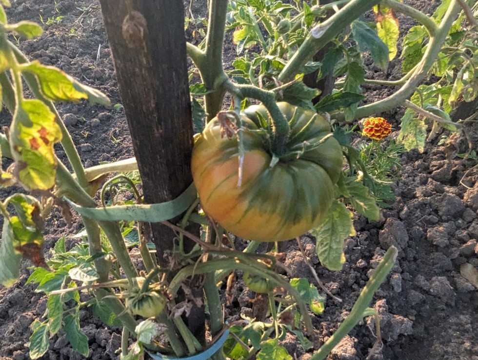 First tomato of the year from the early volunteer plants is starting to turn. Didn't grow much from when the plants went to the garden as the wet weather about killed them. Had to dig a decent hole when planting these larger plants out and our clay became a pond around the root balls about drowning the plants. Hopefully the tomato will have some decent flavor when it finishes as the first one of the year is always a treat