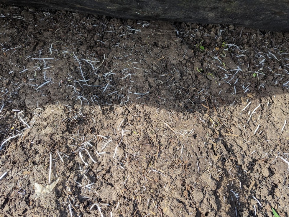 When cleaning up the patches, lifted the fabric for the 1655.5 plant to weed the edges before adding the next runs. Lots of roots on the surface under the fabric and could see pretty clear how far from the plant they were reaching