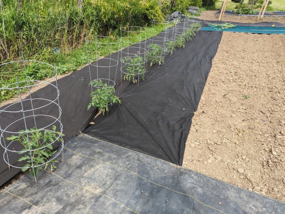Fabric down and tomatoes caged. There's a few megas showing up already