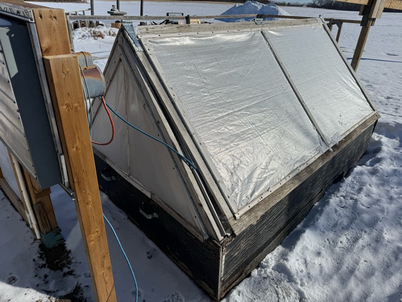 Shop patch. Plugged the heat cable in. This patch is on the south side of a shop wall and melts fairly fast. Today it's -16 C so it's not quite melting.