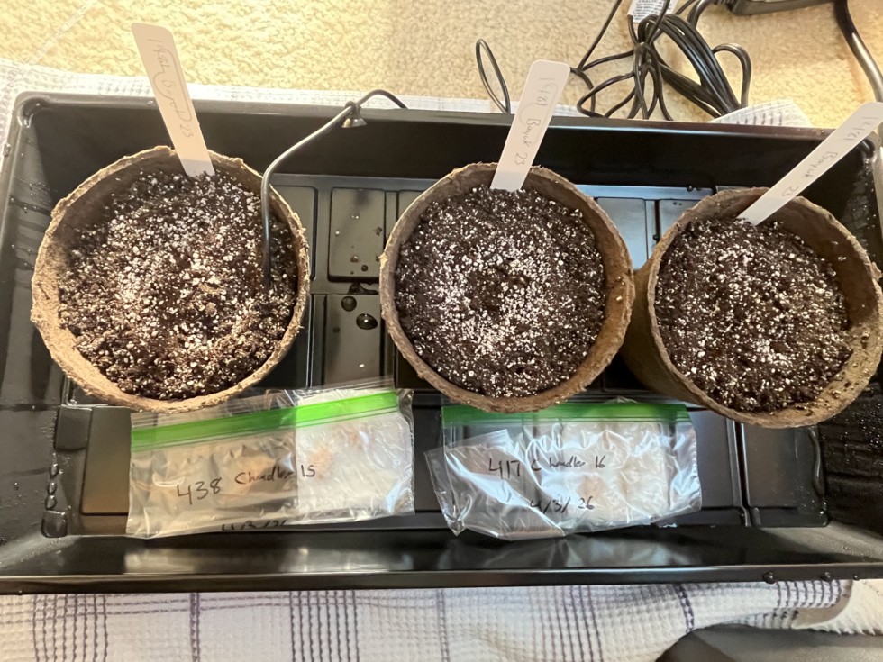 Two of the three seeds from the 1481 Bayuk 23 are sprouting already. Nothing yet on the 438 Chandler 15. In some spots on the seeds they are showing signs of darkening. And the 417 Chandler 16 the seed coating seems to be breaking down. The outside of the shell feels to be getting soft to the touch. May need to restart these ones soon. I have been changing the paper towels, and the Ziploc bags every day. Also, I run the seeds under running warm water to wash them off. I hope the 438 Chandler 15 will sprout because they are my last seeds from Terminator.