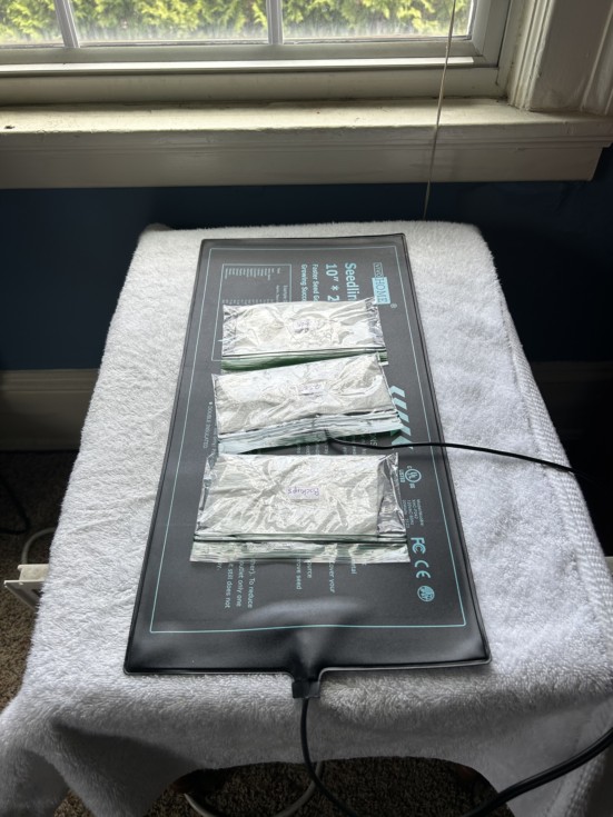 Then into the paper towels. The layers go like this: towel, heating pad set to 90, seeds w/ thermostat sensor in them, another towel on top. I prefer the "Jamie cup" method but I can't do that this time for a reason that is too uninteresting to explain.