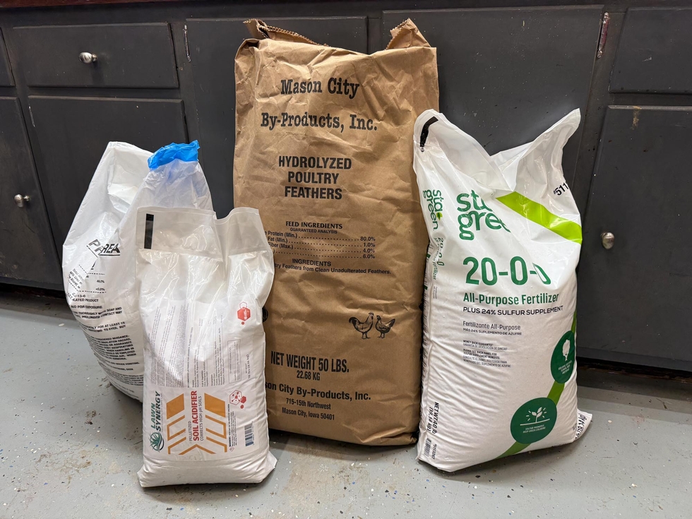 Fertilizer amendments: 25 lbs of feather meal (for a slower released nitrogen source) 2 lbs urea (faster available nitrogen, but short lived) 4.4 lbs Ammonium sulfate (nitrogen + sulfur) 20 lbs Elemental sulfur (pH correction)