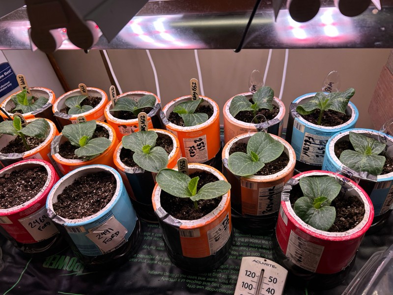 These are my seedling starts 4 days after going into pots (6 days after soaking). The 5 at the far right (with plastic spoons for markers) are for Sam Felten. I am happy with their progress. I think there will be some big pumpkins grown from these seedlings!