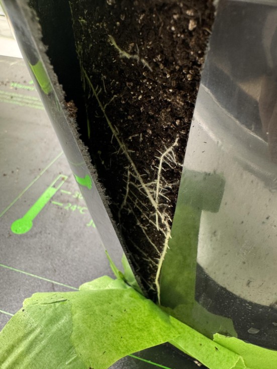 My most aggressive plant, one of the 2741 Haists. Took a sneak peak at the roots. This thing is ready to exit its 2 gallon pot. Soil temp in the hoop house is 70. Tomorrow is planting day!