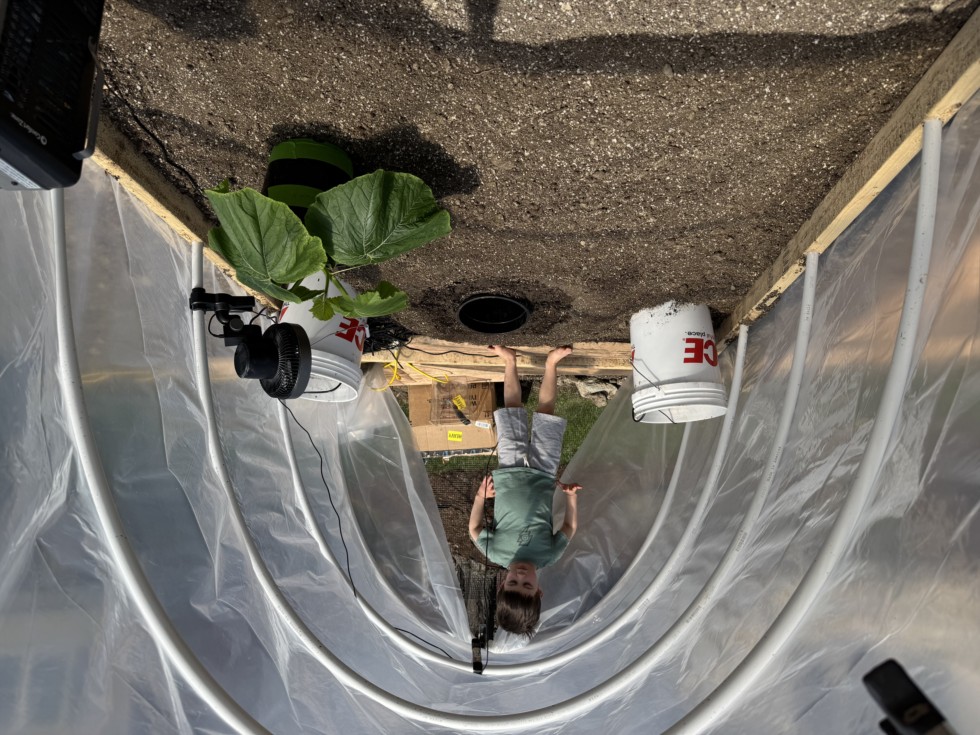 Carson is enjoying the hoop house.