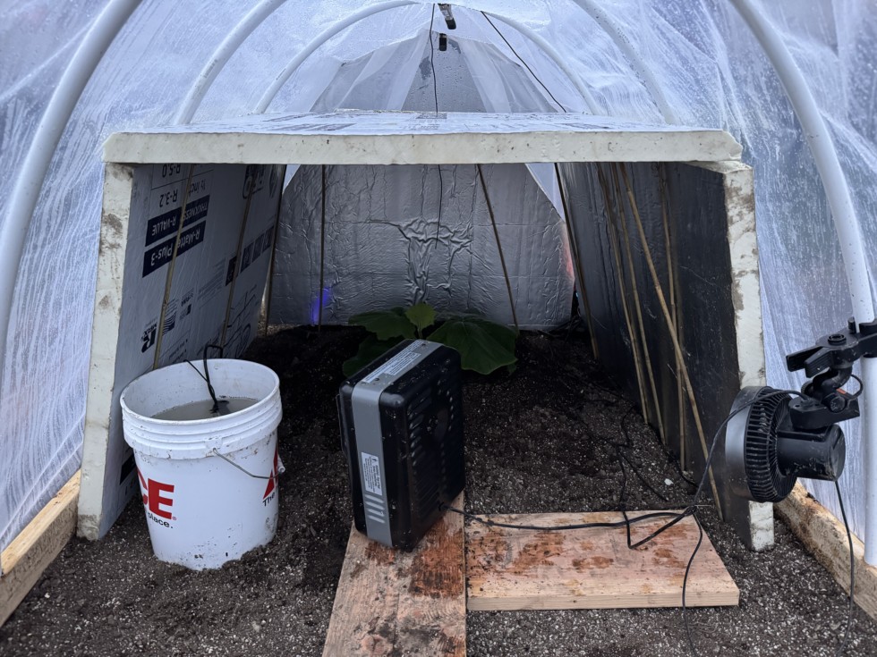 All tucked in for the night. The final 2-inch foam board is in place, officially sealing up the thermal bubble. Between the space heater, the 90 degree water bucket, and the soil cables running at 70, hoping she won't even know it's snowing outside. Catch you all on the other side of the freeze!
